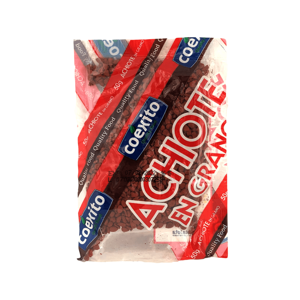Achiote en grano Coéxito El achiote grano es un condimento típico de Centroamérica y Latinoamérica. Directamente traído del Amazonas forma parte de nuestros condimentos, de calidad y tradición. 50g.* *Compra en tienda