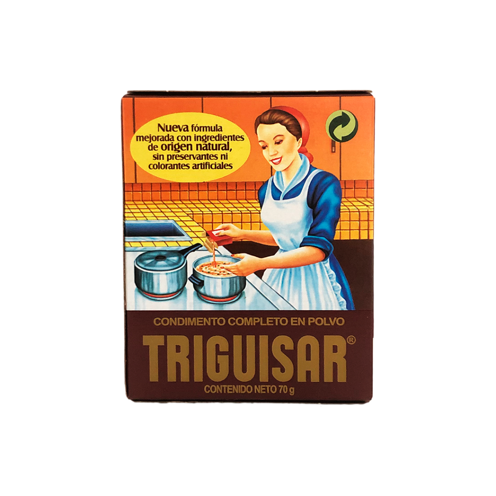 Triguisar Exalta el sabor de tus comidas y da color, conservando las características del sabor y olor propias de la comida. Puede ser usado en sopas, cremas, caldos, salsas, carnes, pollo, pescados, mariscos, vegetales, granos, empanadas, pastas, huevos, arroz, entre otros. Contiene ajo deshidratado, achiote, pimienta negra, comino, aceite esencial de ajo, cúrcuma y ajo natural. 70g.* *Compra en tienda