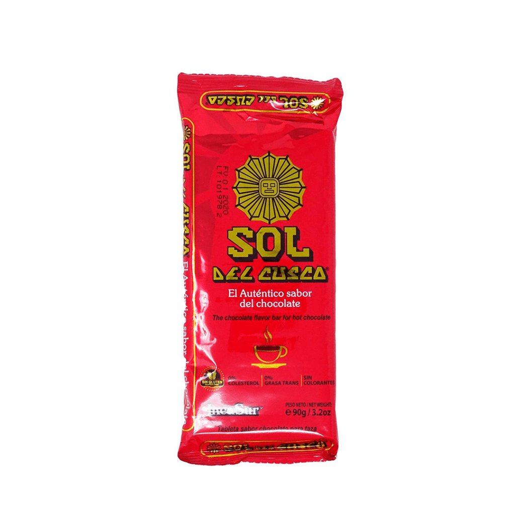 Chocolate Sol del Cusco Es un preparado de cacao en tableta para fundir y obtener el más delicioso chocolate en taza, con aroma a clavo y canela. Se consume en Perú tradicionalmente durante las fiestas de Navidad y Año nuevo, en compañia del panetón, panettone o pan dulce. 90g.* *Compra en tienda